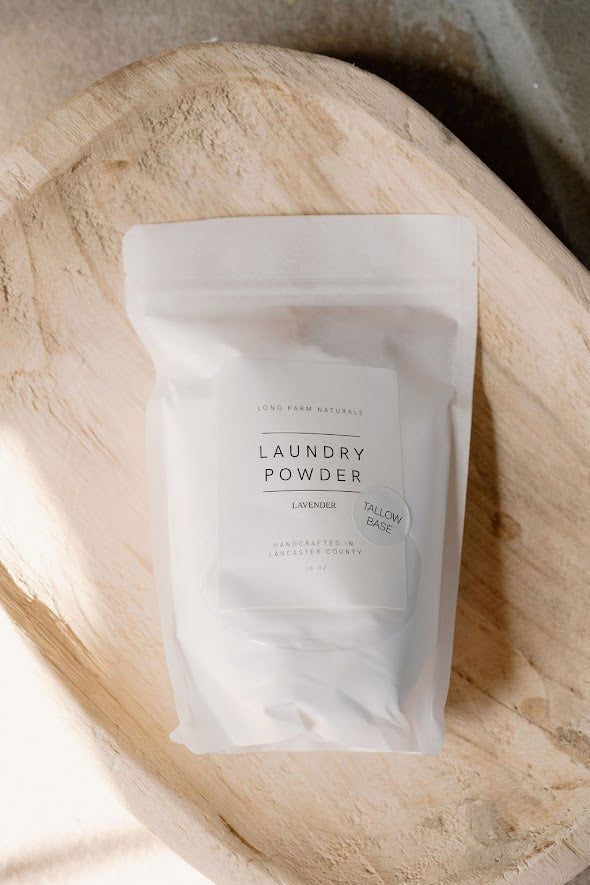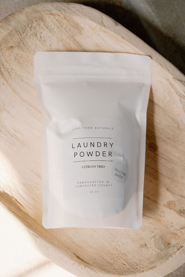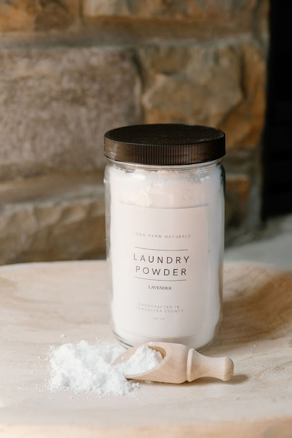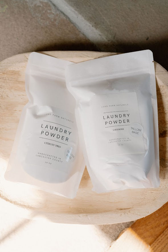 Laundry soap (Lancaster County tallow, water, and lye), oxygen bleach, sodium bicarbonate, washing soda, pure essential oils (unless unscented)